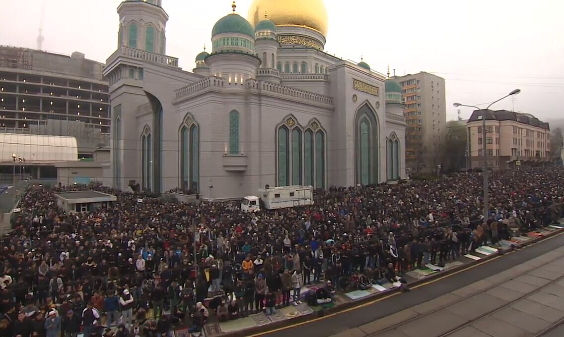 Сотни мусульман собрались в Московской соборной мечети отметить праздник Ураза-байрам утром в среду в столице.
