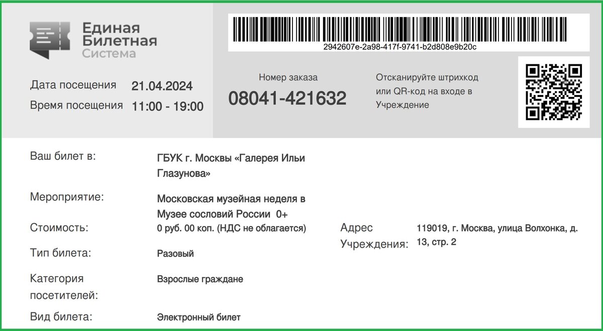 Апрельская музейная неделя как раз началась сегодня. Я заказала билеты в два музея: Музей сословий в галерее Ильи Глазунова и музей Русского лубка. Билеты присылают на электронку вот в таком виде.