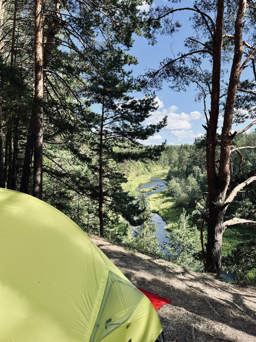 Передо мной громко струилась река. Бурные потоки воды разрывали тишину берёзово-осиновых лесов, раскинутых по двум берегам. Есть два живописных места лично для меня, которые вдохновляют. Первое - вид с проходом сквозь известняковый кряж: красивейший каньон с белыми скалами, как в Карелии. Тут так тихо, почти как в пещерах. Второе - красивое поле с неглубоким речным дном. Здесь громко из-за бурлящего потока. И везде, на дне реки, плоские известняково-крмнёвые плиты, в русле - гранитные ледниковые валуны. Ставить тут палатку одно удовольствие. Благо не советские палатки ставить. Тут все проще - раскинул пол, положил аккуратно основу, втиснул палки за крючки, натянул тент и забил ногой колышки в рыхлую землю. Вуаля, палатка готова. А когда стоит палатка почти над обрывом, ммммм, чувство экстрима. Далее, если есть возможность, то можно сделать и маленький костерок. Тьма сомкнулась вокруг костра узким кольцом. Начало темнеть...Языки пламени освещали стволы ближних деревьев. Тишина бы