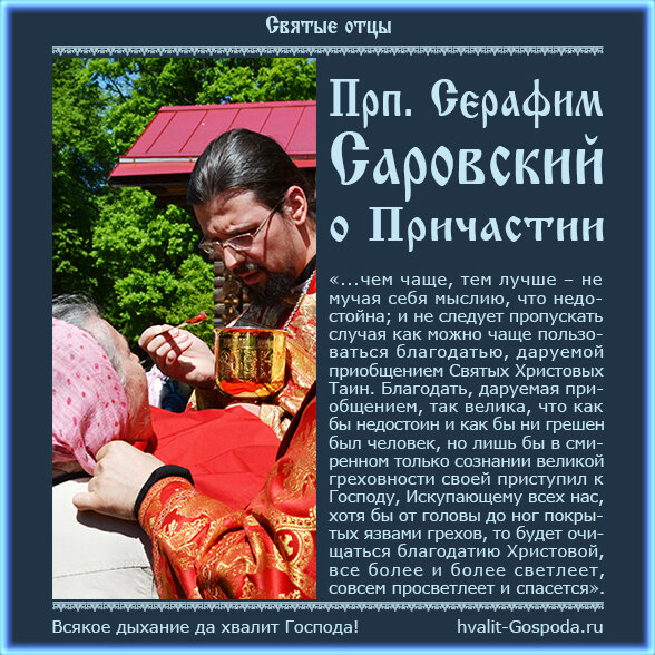 Преподобный Серафим Саровский о Причастии: «чем чаще, тем лучше – не мучая себя мыслию, что недостойна; и не следует пропускать случая как можно чаще пользоваться благодатью, даруемой приобщением Святых Христовых Таин. Благодать, даруемая приобщением, так велика, что как бы недостоин и как бы ни грешен был человек, но лишь бы в смиренном только сознании великой греховности своей приступил к Господу, Искупающему всех нас, хотя бы от головы до ног покрытых язвами грехов, то будет очищаться благодатию Христовой, все более и более светлеет, совсем просветлеет и спасется». Читать на сайте>>> Если Вам понравился материал, поддержите проект лайком, перепостом или посильным переводом: Сбербанк.Онлайн, карта СБ 5336690117772279, yoomoney, boosty.to, cloudtips.ru