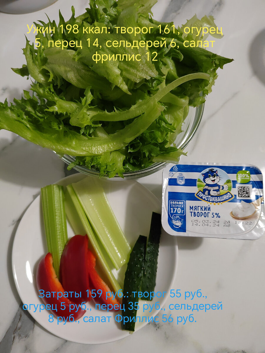 Сегодня легкий ужин: творог 5% Простоквашино 170 гр, листовой салат половина пучка, перец, сельдерей.