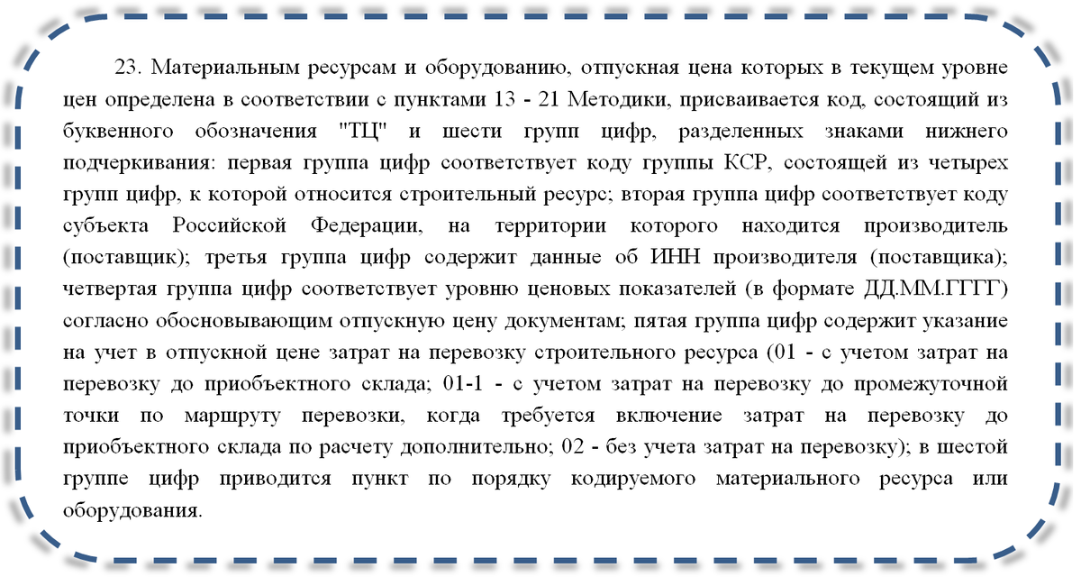 Помимо множества новшеств обращаю Ваше внимание на новую кодировку ресурсов, стоимость которых определена на основании конъюнктурного анализа, то есть в соответствии с пунктами 13-21 Методики. Пункт 23, регламентирующий правила кодировки, изложен теперь в следующей редакции: Более "удобоваримо" пункт 23 можно изложить следующим образом: Если разложить схематично, то получится следующее: Обращаю Ваше внимание, на то, что первые четыре группы цифр остались без изменений, но вот: