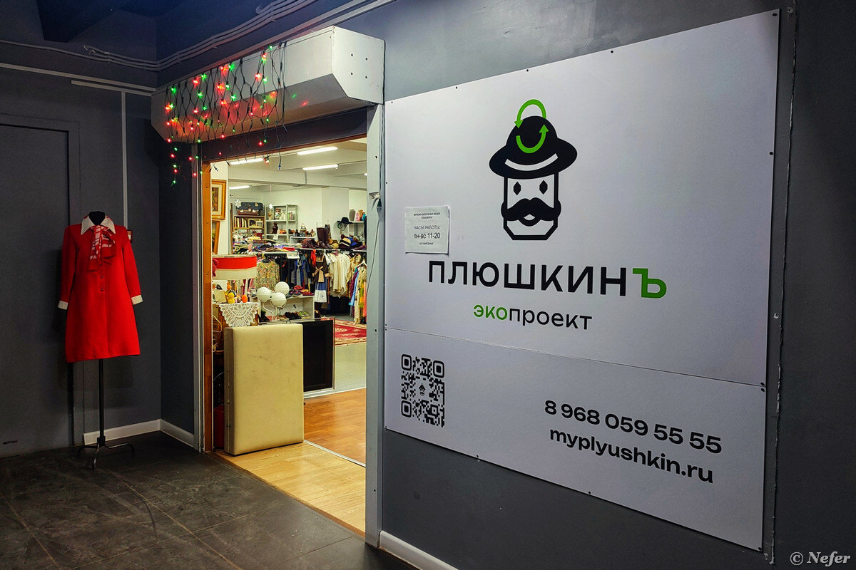 На Авито меня заинтересовала одна вещица. Стала смотреть локацию, откуда самовывоз. Потом перешла в профиль, чтобы изучить другие лоты продавца. Как вы понимаете, это был профиль магазина "ПлюшкинЪ". Решила съездить по указанному адресу в выходные и посмотреть, что за место. Посмотрела, теперь посещаю регулярно. В магазине продаются вещи в хорошем состоянии, которые стали кому-то ненужными. Есть одежда и обувь сэконд-хэнд, вполне современная и слегка немодная. Но интереснее винтаж. Можно найти обувь 70-х и 80-х, старинные сумочки, шляпки, платья и костюмы. Все аккуратно расставлено на полках и бережно развешено на плечики. На