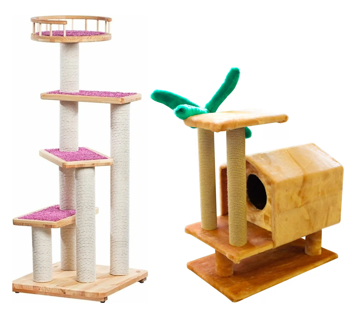 Цена отличалась почти втрое (первый - дороже, второй - дешевле). В конструкциях использованы разные материалы: первый отделан (даже не могу сказать "обит") ковролином, когтеточки - сизалевые; второй обтянут искусственным мехом, когтеточки из джута.
