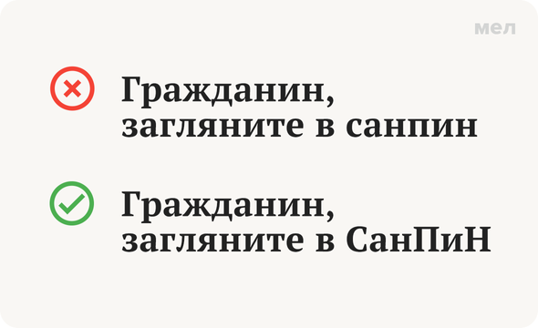 На «Меле» часто выходят статьи, в которых упоминается эта аббревиатура. И буквально каждый раз она ставит наших редакторов в тупик. Сегодня мы решили, что пора с этим кончать — и наконец разобраться, как правильно писать и правильно склонять эту аббревиатуру. Правильно: СанПиН На самом деле с СанПиН все предельно просто. Эта аббревиатура расшифровывается как «санитарно-эпидемиологические правила и нормы». Каждая из трех частей (санитарно-эпидемиологические, правила, нормы) — начинается с прописной (большой) буквы. При образовании множественного числа ориентируемся на слово «правила» и не склоняем данную аббревиатуру — «новые СанПиН». Больше полезных карточек о русском языке — в «Грамотности» на «Меле» в Telegram. Подписывайтесь, чтобы говорить и писать правильно. Фото: D MacDonald / Shutterstock / Fotodom