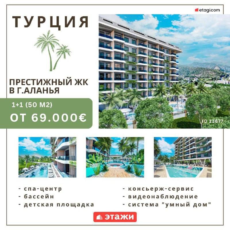 📍О ЛОКАЦИИ Престижный жилой комплекс в городе Аланья, расположенный в районе Демирташ, 2500 метрах от побережья Средиземного моря. ▫️В пешей доступности находятся медицинский центр Alanya Central Clinic и детский сад ABC Gündüz Bakımevi. Ближайшая школа Demirtas Nihal Demirel находится в 5 минутах езды, а крупный торговый центр Yekta Mall с продуктовым магазином Carrefour — всего в 15 минутах на автомобиле 🏢 О ЖК Здесь представлены апартаменты с 1 спальней и дуплексы с 2 спальнями. На территории комплекса будут бассейн и спа-центр. Жилой комплекс состоит из 9 этажей и предлагает широкий выбор жилья, включая апартаменты и дуплексы. Здесь также будут спа-центр, бассейн и детская площадка. 👉Для удобства жителей предусмотрен консьерж-сервис, а также видеонаблюдение на всей территории и система "умный дом". 💰СТОИМОСТЬ И СРОК СДАЧИ 1+1 (50 м2) от 69.000€ 2+1 (120 м2) от 85.000€ Сдача Проекта запланирована на II квартал 2025 года. 🌅Это идеальное инвестиционное предложение с гарантиров