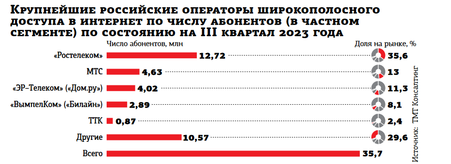 Бум распространения широкополосного доступа в интернет в крупных городах пришёлся на конец 2000–х годов. По подсчётам J’Son & Partners Consulting, в 2009 году по всей России было 14,43 млн абонентов домашнего интернета, а уже к концу 2012–го их число увеличилось в 1,7 раза, достигнув 24,73 млн. Ежегодно количество подключений росло примерно на 15–25%.