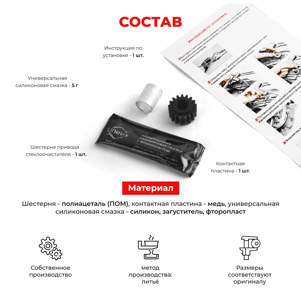 Cтеклоочиститель перестал очищать лобовое стекло? При работе слышны посторонние звуки? Причина в износе шестерни плавающего дворника. В автосервисах сразу предлагают заменить сломанный узел на новый, считая, что он не ремонтопригоден. Но зачем менять весь узел целиком, если изношена только шестерня? Забудьте об этой проблеме с помощью ремкомплекта привода трапеции стеклоочистителя! В состав комплекта входит: Инструкция по установке шестерни плавающего стеклоочистителя D-7 1. Выставьте стеклоочиститель в крайнее положение, (состояние покоя),