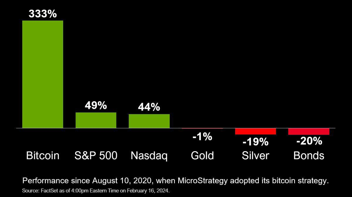 Это данные роста с 2020 по 2024 гг. За это время Биткоин вырос на 333%, оставив далеко позади себя абсолютно все остальные типы активов. Даже если сложить вместе проценте всех остальных наиболее популярных инвестиционных инструментов, то это число всё равно окажется меньше, чем рост одного Биткоина.