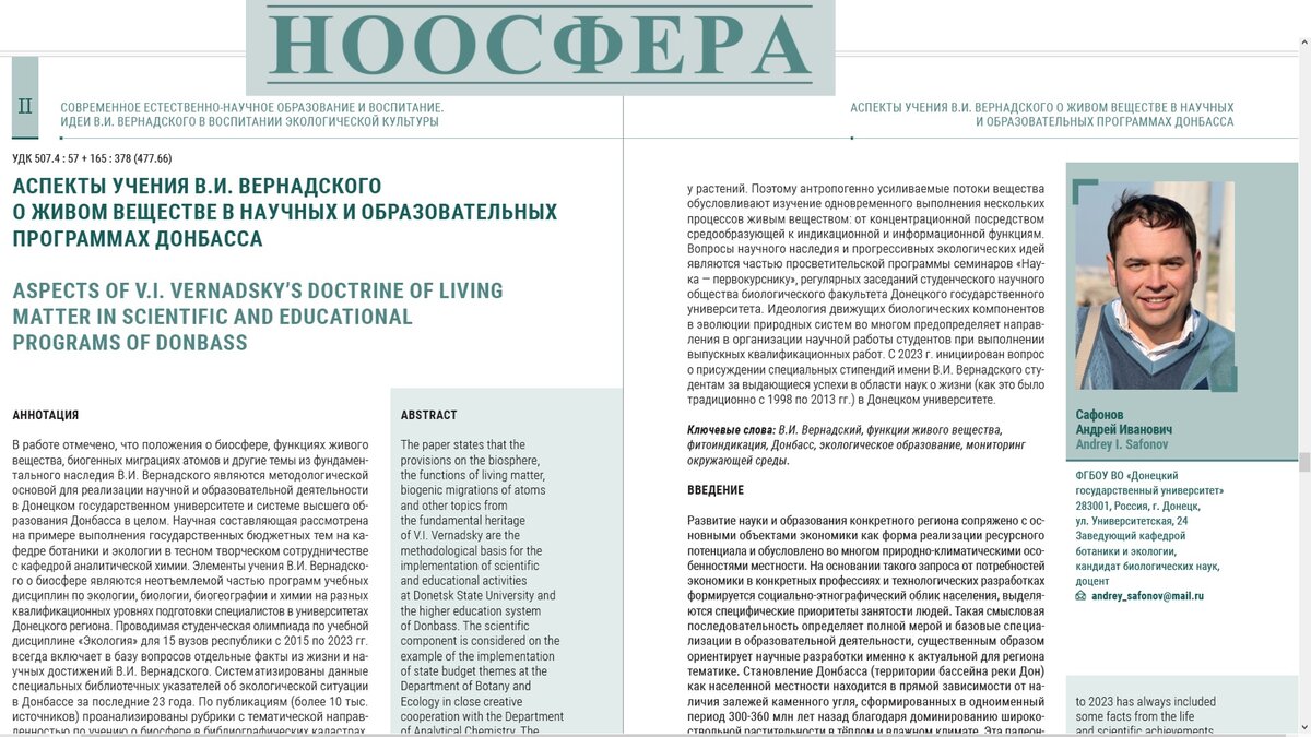 К юбилею академика В.И. Вернадского было инициировано формирование специального выпуска статей в журнале «Ноосфера». В составе авторов статей ведущие учёные Российской Академии наук, Московского государственного университета им. М.В. Ломоносова, научно-исследовательских институтов и вузов России. В статье заведующего кафедрой ботаники и экологии Андрея Сафонова «Аспекты учения В.И. Вернадского о живом веществе в научных и образовательных программах Донбасса» содержится информация об исследовательских темах и многих мероприятиях (конференциях, конкурсах, олимпиадах), регулярно проводимых на биологическом факультете с 2014 года. Научный редактор журнала, профессор, ведущий научный сотрудник Института геохимии и аналитической РАН Вадим Викторович Ермаков в резюмирующей части к статье отметил: - В Донецком университете развиваются элементы биогеохимии, геохимической экологии и индикационной ботаники. В целом, достижения ученых, преподавателей и студентов Донецкого университета впечатляют.