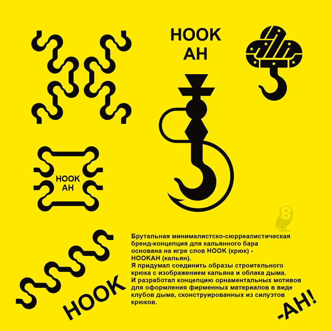 Концепция основана на игре слов: hookah (кальян) и hook (крюк). Поиск решения для лого и варианты орнаментальных мотивов для оформления фирменных материалов.
