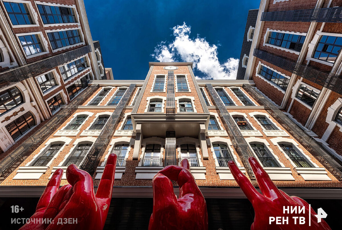 А во внутреннем дворе эффектный арт-объект в виде красных рук.