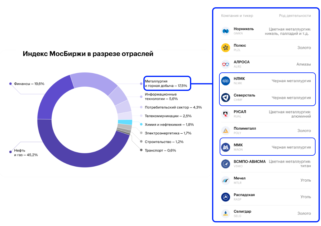 Металлургический сектор является основным на ряду с нефтегазовым и банковским в нашей экономики: В индексе Мосбиржи компании из этого сектора занимают около 17.5%. В эту отрасль входят 3 крупнейших металлургических предприятия нашей страны - Северсталь, НЛМК и ММК.