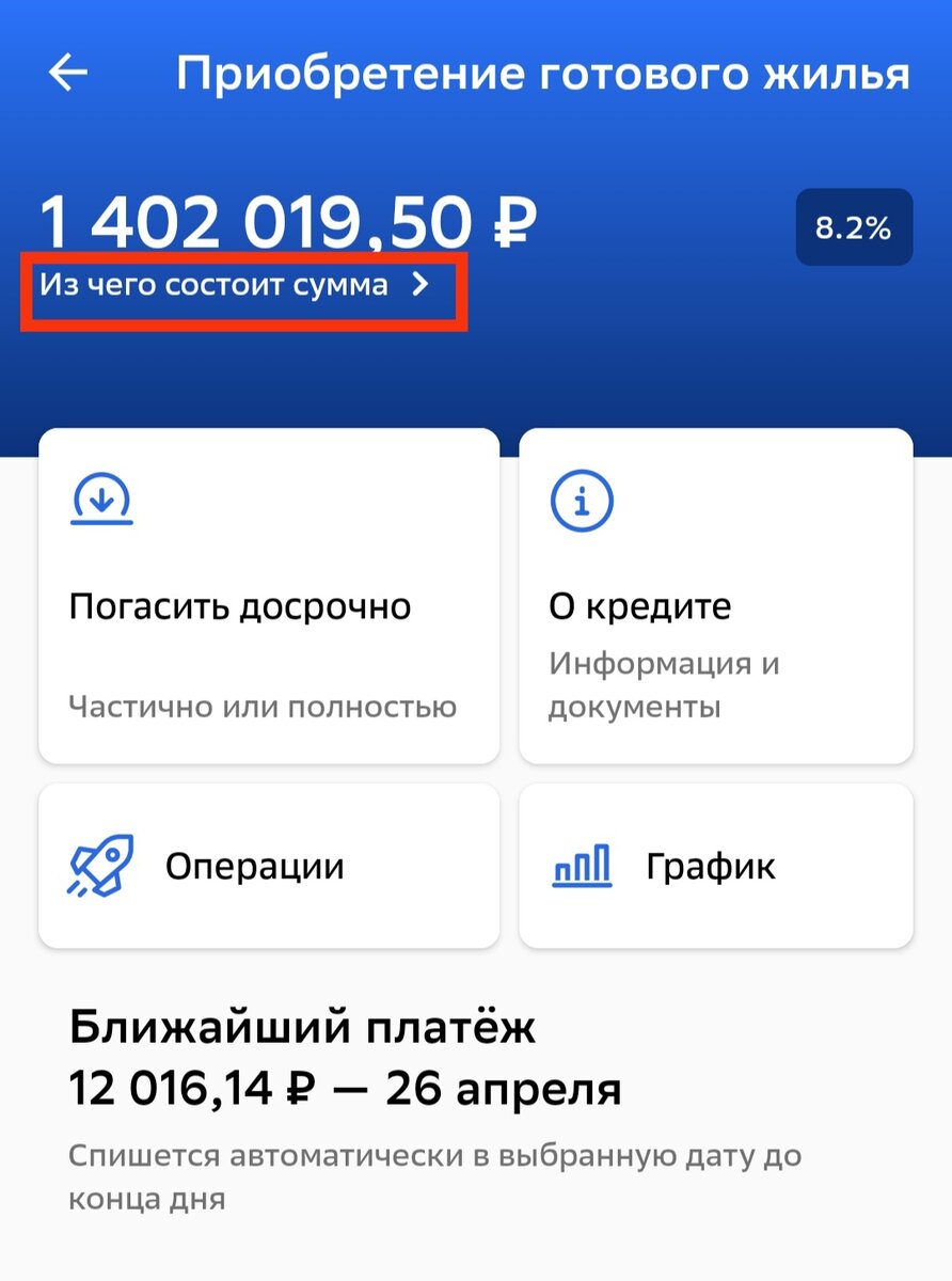 Ежемесячный платеж состоит из двух частей - основной долг и проценты, посмотреть их соотношение можно в графике платежей. Для этого переходим в сам график и нажимаем на строку текущего месяца: