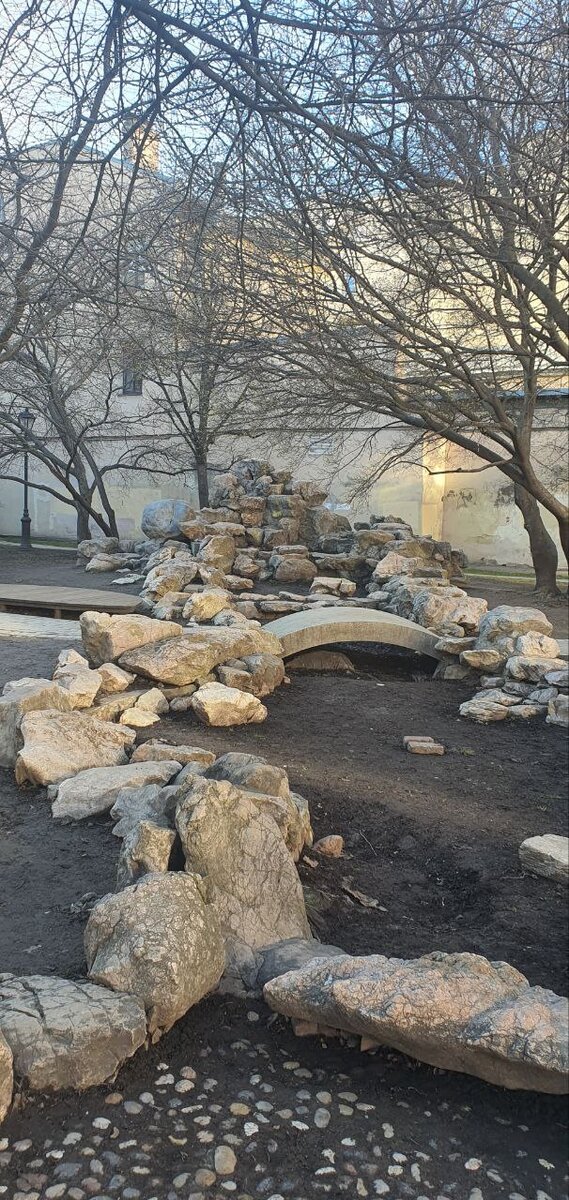 Как "Сад Радости" стал "Садом Дружбы". Прежде, чем подойти ко льву и поиграть с ним, предлагаю начать путешествие в Китай с небольшого пруда с маленьким мостиком. Пруд сформирован крупными камнями. Надеюсь, когда пойдут дожди, заработает и фонтан. Приедем летом - обязательно проверим и добавим фотографии. Пока это место позволяет хорошо поработать воображению). Рядом - навес в форме двух перпендикулярных прямых. Тут можно укрыться от небольшого дождя. Через "естественный" городской барьер в виде припаркованных машин, неожиданная стена с 9 цветными керамическими драконами. На вид драконы практически все весьма свирепы, и это неспроста - по китайской традиции, эти драконы должны отпугивать злых духов. Непростая задача. На сегодня мой выбор - желтый дракон, после зимы очень хочется яркого. Слева - пагода для чайной церемонии и медитации: Ее охраняют два льва, причем с одним из них очень хочется поиграть - засунуть ему в пасть руку и покатать шарик. Тот редкий случай, когда это безопасно)