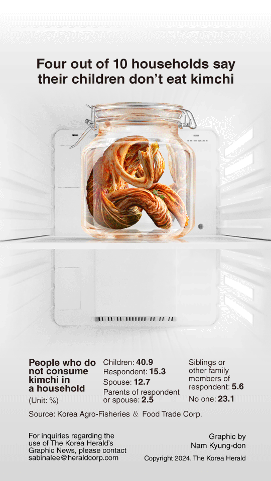 Доля детей, которые не едят кимчи, постепенно растет: 32,3 процента в 2020 году, 37,2 процента в 2021 году и теперь 40,9 процента.