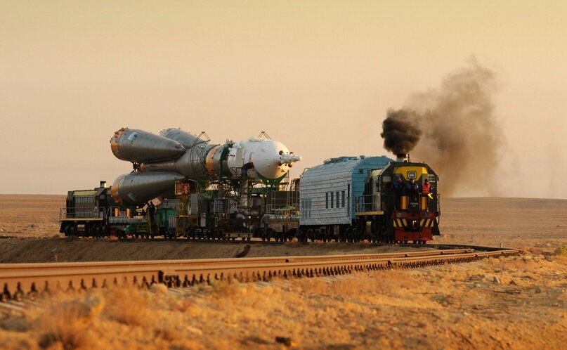 Путь к звездам большинства ракет начинается по железной дороге ! Железная дорога на Байконуре сегодня — это более 450 километров неэлектрифицированных железнодорожных путей и около 40 километров путей специального назначения. К сожалению, нет информации о том, какой именно локомотив подавал ракету-носитель «Восток», на которой Юрий Гагарин отправился в первый в мире космический полёт. Точно можно сказать лишь то, что это была «эшка» (паровоз Эу 709-81), отреставрированные версии которых сейчас можно встретить на самых разных станциях. Климат-вагон необходим для того, чтобы поддерживать необходимые температуру, влажность и прочие параметры, требуемые для обеспечения сохранности столь ценного груза при транспортировке. Помимо прочего, скорость движения состава строго ограничена пятью километрами в час. По прибытии на стартовую площадку ложемент с ракетой-носителем устанавливается в вертикальное положение, ракета фиксируется на стартовом столе, ложемент опускается и состав отъезжает. Кос