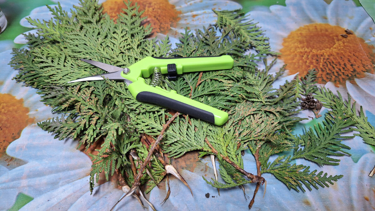 После того, как во время обеда два дня назад спасла одну ветку туи и тем самым приблизила исполнение своей мечты, дома принялась за подготовку полученных черенков к посадке. Заодно и новые садовые ножницы протестировала.