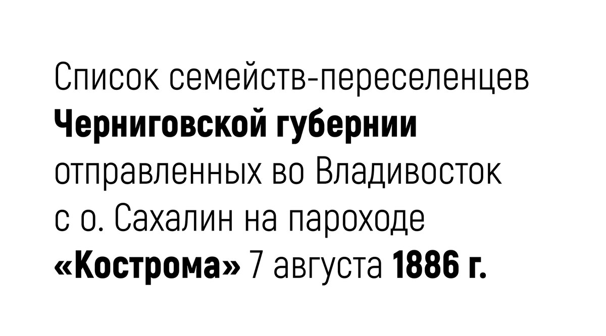 Ниже привожу список семейств-переселенцев с. Вознесенское о. Сахалин, отправленных во Владивосток на пароходе «Кострома» летом 1886 г. (ранее они были отправлены из Черниговской губернии на Амур, а позже