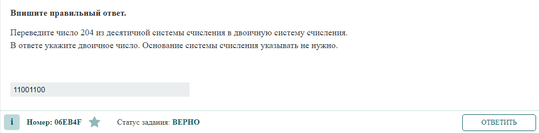 Переведите число 204 из десятичной системы счисления в двоичную систему счисления. В ответе укажите двоичное число. Основание системы счисления указывать не нужно. ЧТО НУЖНО ЗАПОМНИТЬ? Правила перевода из десятичной системы счисления в двоичную С помощью деления на два. 1. Последовательно выполнять деление исходного целого десятичного числа и получаемых целых частных на 2. 2. Записать полученные остатки в обратной последовательности. Пример: Переведем число 105 из десятичной системы счисления в двоичную: 105/2=52 (ост. 1) 52/2= 26 (ост. 0) 26/2=13 (ост. 0) 13/2= 6(ост. 1) 6/2= 3(ост. 0) 3/2 = 1(ост. 1) 1/2= 0 (ост. 1) Переписываем снизу вверх 105₁₀ = 1101001₂ РЕШЕНИЕ 204/2=102 (ост. 0) 102/2=51 (ост. 0) 51/2=25 (ост. 1) 25/2=12 (ост. 1) 12/2=6 (ост. 0) 6/2=3 (ост. 0) 3/2=1 (ост. 1) 1/2= 0 (ост. 1) Переписываем снизу вверх: 204₁₀ = 11001100₂ ОТВЕТ 11001100