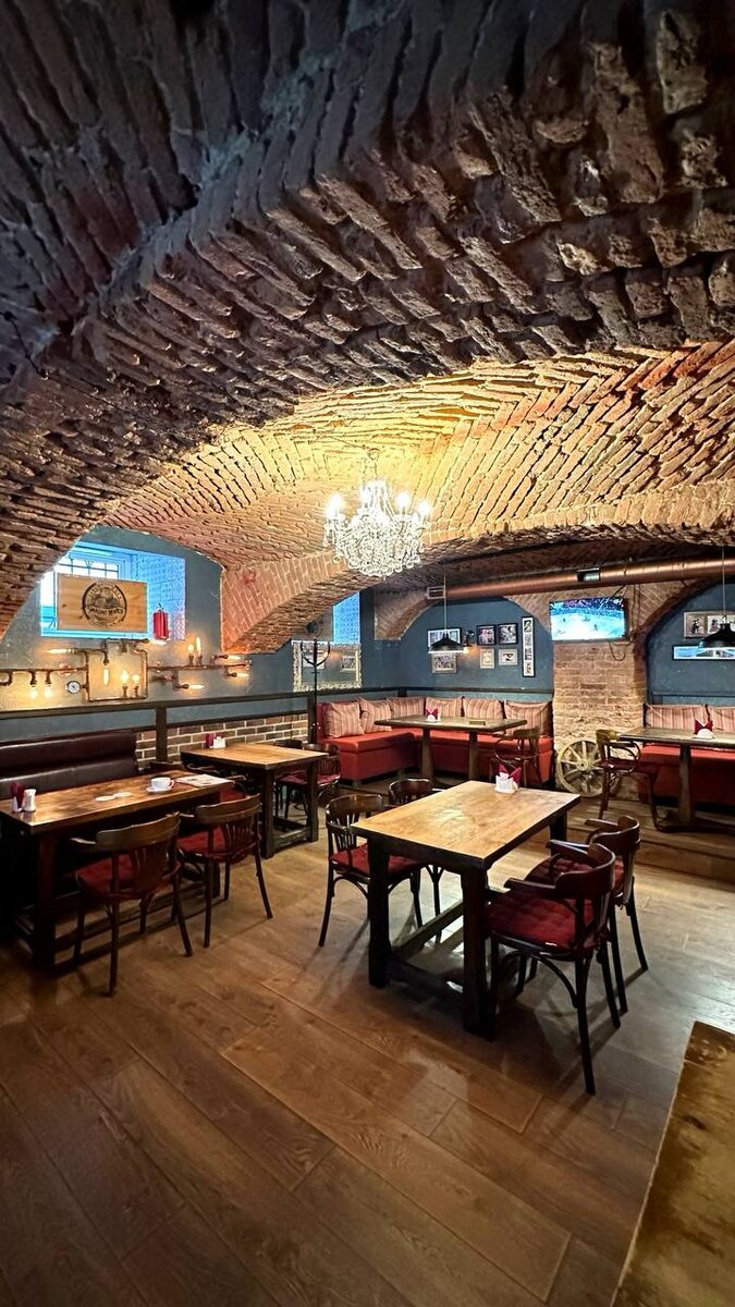Бар/ресторан чешской кухни «Чешская пивница». Цокольное помещение, 2 зала, красный кирпич, синие стены, плитка, странные лампы и красивая люстра под потолком Музыкальное сопровождение в стиле рок. Здесь собираются компании дешево выпить и вкусно поесть. В меню появилась корюшка 🐟(690₽), естественно сразу её взяла, ну и давно хотела шашлык из свинины (540₽), на гарнир тушеную квашеную капусту (180₽). Денис заказал грибной суп (370₽) и говяжий язык. Ну и пиво)) Все очень вкусно, очень сытно, и очень большие порции, все не влезло)) Интерьер конечно на любителя, но зато пиво дешевое). В Петербурге таких 3 бара.