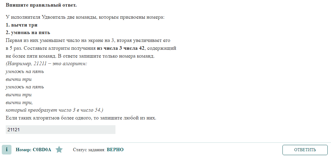 не более пяти команд. В ответе запишите только номера команд. (Например, 21211 –– это алгоритм: умножь на пять вычти три умножь на пять вычти три вычти три, который преобразует число 3 в число 54.) Если таких алгоритмов более одного, то запишите любой из них. РЕШЕНИЕ Будем идти от числа 42 к числу 3 применяя противоположные команды, так мы будем видеть когда промежуточный результат можно без остатка поделить на 5. Тогда мы имеем команды: 1. Прибавь 3 2. Раздели на 5 1) 42 нельзя без остатка поделить на 5, прибавим: 42 + 3 =45 Команда 1 2) 45 можно без остатка поделить на 5: 45/5=9 Команда 2 3) 9 нельзя без остатка поделить на 5, прибавим: 9 + 3 =12 Команда 1 4) 12 нельзя без остатка поделить на 5, прибавим: 12 + 3 =15 Команда 1 5) 15 можно без остатка по