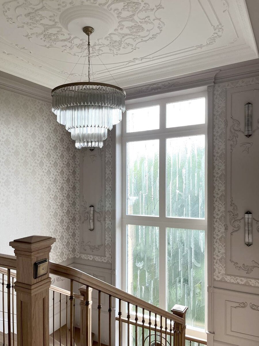 В создании интерьера центральной лестницы использовались декоративные элементы RODECOR из коллекций «Царскосельский Рококо» и «Три века Барокко», а также карнизы и молдинги от бренда «Европласт».