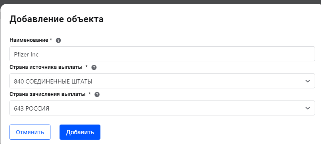 На вкладке "Сведения об источнике дохода" - выбираем "За пределами РФ" - "Добавить источник дохода". Далее указываем наименование организации, страну выплаты и страну зачисления. Все эти данные есть в отчете брокера, берем оттуда. Вот пример для Pfizer: