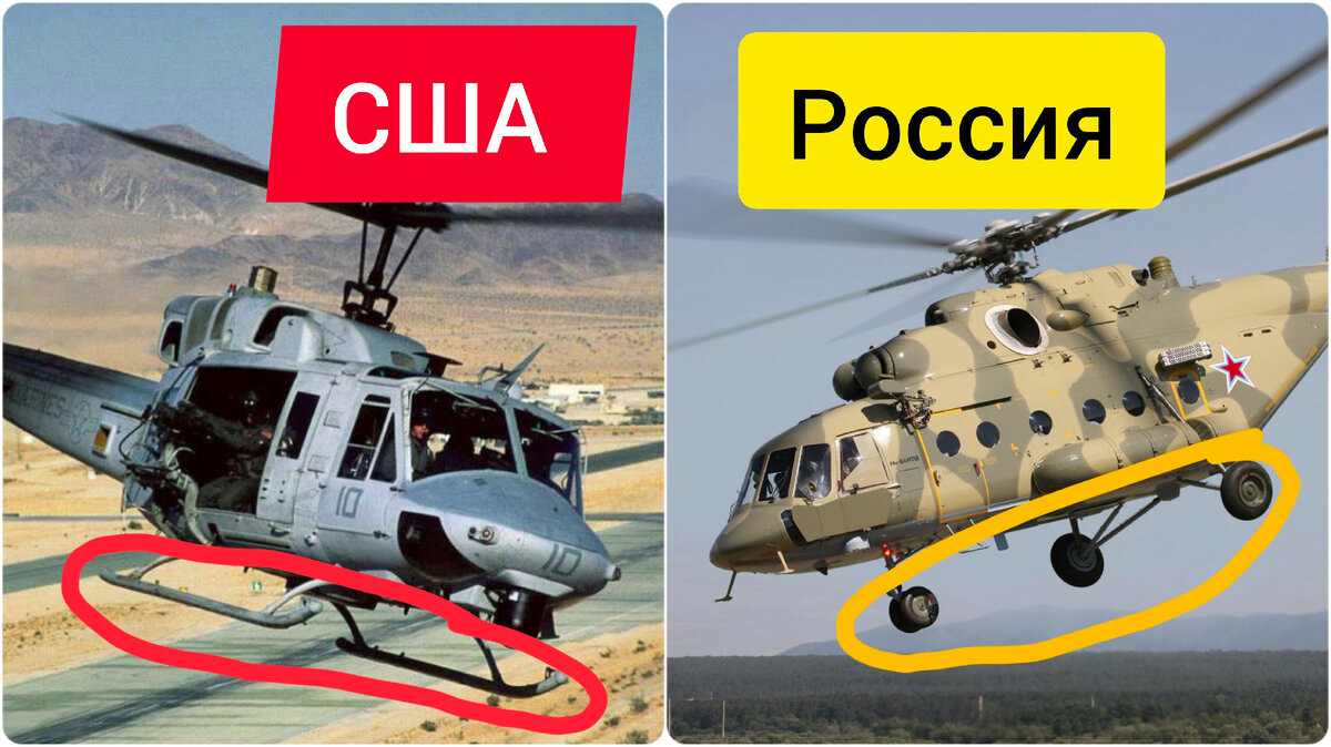 Если быть уж совсем формалистом, то и российских вертолётов есть модели с полозьями, и у американских — с колёсами, но если смотреть в целом, то в большинстве случаев наши отечественные вертолёты с колёсами, а американские и европейские — с полозьями. Почему так? Причин для таких различий много: от цены и габаритов до особенностей ландшафта разных регионов.