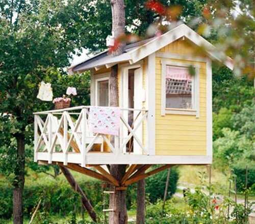 Если это будет место для уединения и игр, то нам нужен небольшой, простой в конструкции домик с яркими цветами. Представьте себе очаровательную деревянную хижину, куда можно забраться по уютной лесенке и часами играть в приключения.