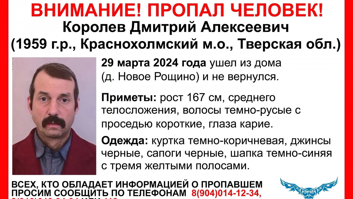 Краснохолмском округе Тверской области, в деревне Новое Рощино 29 марта ушел из дома и пропал 64-летний Дмитрий Алексеевич Королев. Ориентировку на поиск мужчины опубликовал тверской волонтерский поисково-спасательный отряд "Сова". Приметы: рост 167 см, среднего телосложения, волосы темно-русые с проседью короткие, глаза карие. Одежда: куртка темно-коричневая, джинсы черные, сапоги черные, шапка темно-синяя с тремя желтыми полосами. Всех, кто обладает информацией о пропавшем, волонтеры просят сообщить по телефонам: 8 (910) 646-34-34, 8 (904) 014-12-34