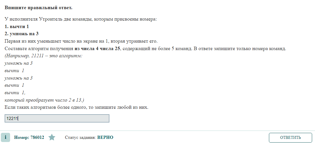 У исполнителя Утроитель две команды, которым присвоены номера: 1. вычти 1 2. умножь на 3 Первая из них уменьшает число на экране на 1, вторая утраивает его. Составьте алгоритм получения из числа 4 числа 25, содержащий не более 5 команд. В ответе запишите только номера команд. (Например, 21211 –– это алгоритм: умножь на 3 вычти 1 умножь на 3 вычти 1 вычти 1, который преобразует число 2 в 13.) Если таких алгоритмов более одного, то запишите любой из них. РЕШЕНИЕ Будем идти от числа 25 к числу 4 применяя противоположные команды, так мы будем видеть когда промежуточный результат можно без остатка поделить на 3. Тогда мы имеем команды: 1. Прибавь 1 2. Раздели на 3 1) 25 нельзя без остатка поделить на 3, прибавим: 25+1=26 Команда 1 2) 26 нельзя без остатка поделить на 3, прибавим: 26+1=27 Команда 1 3) 27 можно без остатка поделить на 3: 27/3=9 Команда 2 4) 9 можно без остатка поделить на 3: 9/3=3 Команда 2 5) 3+1=4 - искомый результат Команда 1 Переписываем номера команд снизу вверх , так