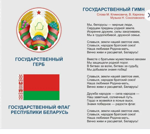 Так получилось, что находясь в Беларуси перевел на русский гимн братской республики Не судите строго это от души Гимн Беларуси Мы беларусы трудимся мирно, Преданы сердцем свободной стране, Щедро мы дружим, но страха не видно, Врага не потерпим в родной стороне Вместе с друзьями не раз мы вставали, Чтобы беду не пустить на порог, В битве за правду клятву давали, Добудем Победу - это наш долг Сила народа врагу неподвластна, Так завещали наши деды, Пусть развивается мирно и властно, Знамя Победы нашей страны Пр. Славься земли нашей светлое имя, Славься народов братский союз, Мы тебя любим родная отчизна, Вечно живи и цвети Беларусь!