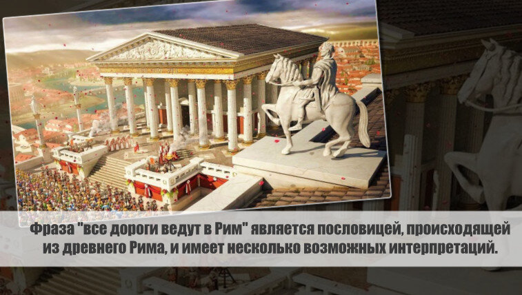 Фраза "все дороги ведут в Рим" является популярной пословицей из древнего Рима с множеством возможных интерпретаций. Географический смысл этой фразы основан на реальной дорожной сети в древнем Риме, которая была жизненно важной для связи различных областей империи с городом Римом - ее центром. Таким образом, фраза подразумевает, что независимо от места вашего отправления, в конечном итоге вы обязательно окажетесь в Риме.