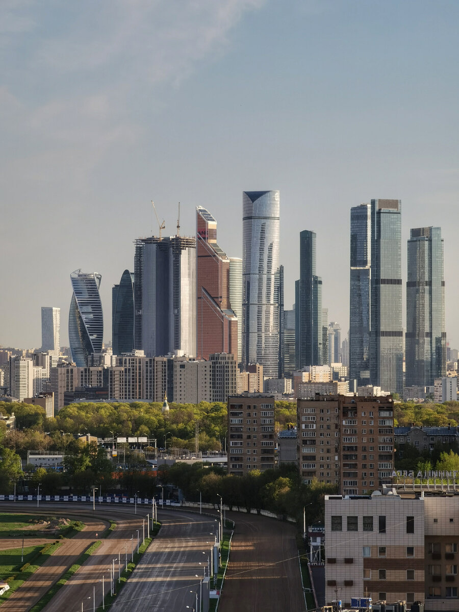 Давайте познакомимся: их зовут "Evolution Tower" ("Эволюция"), "Империя", "Город столиц" и "Башня на Набережной". Высота 55-60-76-59 этажей соответственно. В небоскребах расположены многочисленные офисы, апартаменты, торговые галереи, рестораны, кафе, фитнес-центры, медицинские клиники и прочие прелести. Теоретически, человек может даже не покидать пределы здания, чтобы совмещать трудовую деятельность с бытовыми заботами и досугом. На практике такое встречается не так часто, поэтому сотни автомобилей по вечерам покидают территорию делового комплекса, чтобы утром вернуться сюда вновь. За башнями виднеется Москва-река и застройка района Дорогомилово.