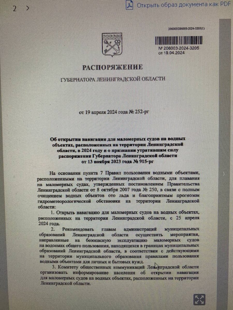 1 Распоряжением губернатора Ленинградской области об открытии с 25 апреля 24 года навигации маломерных судов на водоемах Ленобласти