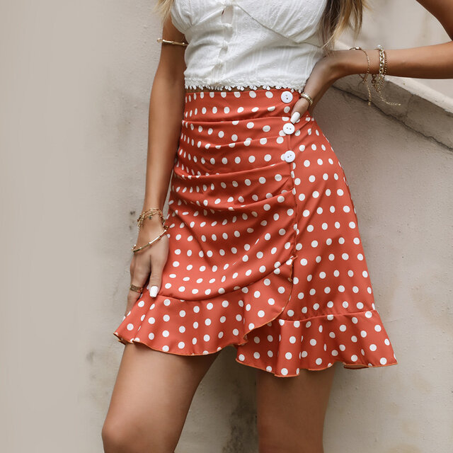 Наша мини-юбка в горошек с высокой талией — это не только модный акцент, но и удобство благодаря пуговицам и молнии.
