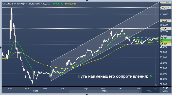В отсутствие идей рынок идет по пути наименьшего сопротивления В отсутствие идей рынок идет по пути наименьшего сопротивления Курс доллар/рубля на Мосбирже интервалами в 1 минуту Курс доллар/рубля на Forex интервалами в 4 часа Путем наименьшего сопротивления для рубля остается движение вниз (вверх по доллару). В отсутствие явных драйверов ползучий рынок вытягивает вверх по тренду доллара. Любое «болото» рискует смениться быстрым усилением импульса, потому что спекулянты начнут идентифицировать слабую и сильную сторону рынка. На графике видно, как прежний бычий тренд сменился горизонтальной консолидацией. Мы в середине боковика, но есть явное желание графика идти вверх в попытке закрепить прорыв из восходящего треугольник. Золотой кросс из 55- и 200-дневной скользящей средней сохранят также бычий сигнал. Цели всей этой конструкции: среднесрочно — 101,90, долгосрочно 121,45, далее на рынок снова вернется маркет-мейкер под именем «чиновник». Аналитики обещают усиление экспортной активност
