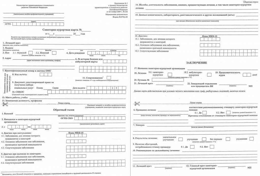 Одним из методов лечения хронических болезней является пребывание в санатории. Санатории обычно расположены в экологически чистых местах, иногда в районах водных источников или гор, в зависимости от профиля заболеваний. Свежий воздух, правильная пища наряду с лечебными процедурами способствуют восстановлению здоровья. Чтобы попасть в санаторий, необходимо иметь при себе некоторые документы, одним из которых является санаторно-курортная карта (форма N 072/у). Санаторно-курортная карта содержит личные данные пациента, а также информацию о его здоровье, включая сведения об основных и о сопутствующих заболеваниях. Заполняется она лечащим врачом после прохождения медосмотра и имеет строго установленную форму. Она помогает лечащему доктору санатория ознакомиться с анамнезом и течением заболевания, поскольку содержит выдержки записей амбулаторной карточки больного. Врачу не придется проводить долгие беседы с пациентом, а также изучать все его выписки для назначения санаторного лечения. А паци