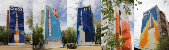 Благодаря знакомству с администрацией города и первому путешествию в Байконур появилась идея увековечить известнейшие Советские и Российские космические объекты на стенах домов. Так наши художники создали 5 муралов с изображениями космического корабля Союз, ракеты-носителя Протон, Лунохода, космического кораб