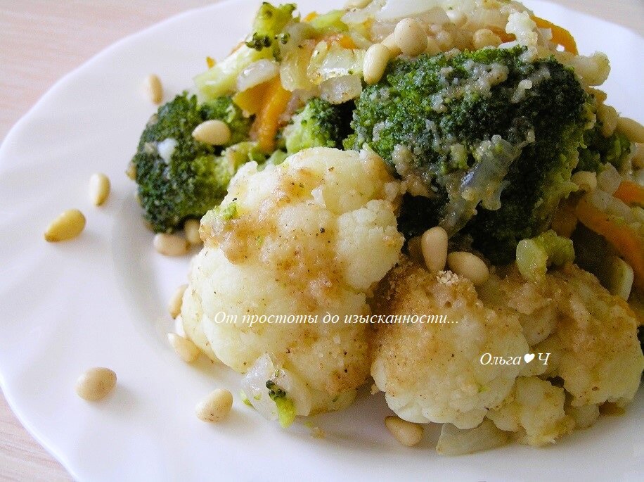 Обжарьте лук на растительном масле, добавьте морковь, обжарьте 2-3 минуты. Добавьте цветную капусту и брокколи, тушите 5-7 минут. Посолите, поперчите, добавьте нарезанный чеснок и панировочные сухари. Перемешайте, тушите еще 2-3 минуты, до мягкости овощей. Разложите по тарелкам, посыпьте кедровыми орешками и подавайте. Приятного аппетита! Вам также могут понравиться: