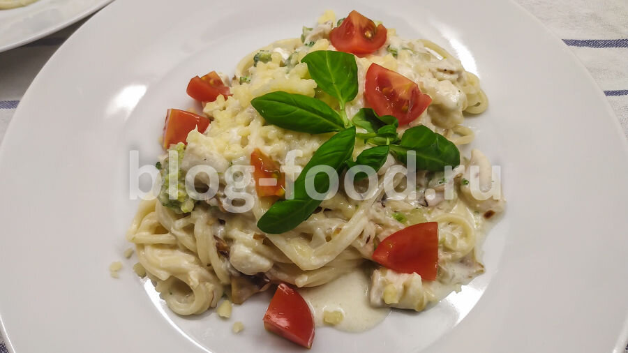 Всем привет! Сегодня ещё один рецепт приготовления пасты. На этот раз — с треской, сыром, стружкой тунца и сливочным соусом. Паста, по большому счёту, может быть любой. У нас спагетти, но ничто не мешает использовать тальятелле, пенне, да хоть бы и рожки с вермишелью — всё равно будет вкусно! Продуктовый набор: Рыбу режем ломтиками, брокколи разбираем на соцветия и стебли, лук режем кубиком. Пасту отвариваем в подсоленной воде до готовности, снимаем с огня. Лук обжариваем минуту на сильном огне. Добавляем стебли брокколи, жарим минуту. Добавляем рыбу, соцветия брокколи, жарим три минуты. Вливаем сливки, солим, перчим по вкусу, готовим пару минут, периодически помешивая. Добавляем спагетти, немного воды из-под них, стружку тунца, доводим до кипения, готовим две-три минуты. Раскладываем по тарелкам, подаём с листочками базилика, ломтиками помидоров и тёртым сыром. Приятного аппетита! Видеоверсия рецепта