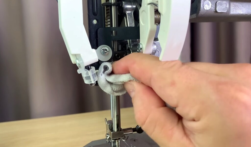 - Очистите все части игольной пластины, лапки и держателя иглы от скопившегося текстильного мусора, сделать это удобно будет при помощи мягкой тряпочки.