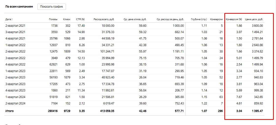 Обычно цены растут или стабильный по части направлениям, а тут явный спад 3 года подряд. Смотрим статистику по кварталам на фото. Посмотрел в таком разрезе по годам нашел ответы по такой динамике. Что спрятано в статистике. В ней сильно прыгают конверсии и тут много нюансов, и они выгодные для заказчика. - Гибкость. Нет щебня, нет земли, сезон по земле закачивается или наоборот, заявки на неделю две вперед. Мы останавливаем рекламу. Так же получили крупный заказ, тормозим все, что связано с техникой или материалами. Заказчик не тратит бюджет, а менеджеры не делают лишней работы по отказам. - Сезонность. Раньше или позже начинается, менеджеры нам передают актуальные данные и мы выбираем стратегию под рекламу, агрессивная, когда простаивают мощности, оптимальная, когда есть работа на несколько дней вперед, эконом, работы много, но есть «окна» в очереди. - Концентрация. 1 квартал 2024 года, много снег