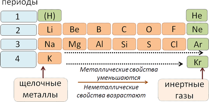 Содержание статьи. Химические свойства атомов обусловлены их способностью отдавать или при-нимать электроны. Металлические свойства - это способность атомов отдавать электроны (вос-становительные свойства). Неметаллические свойства - это способность принимать электроны (окисли-тельные свойства). Самые яркие металлические свойства у франция Fr, а неметаллические - у фтора F. 2. Валентность элементов в формулах высших оксидов возрастает от I до VII, а в формулах летучих водородных соединений уменьшается от IV до I. Формулы высших оксидов (1-7 группы): R2O, RO, R2O3, RO2, R2O5, RO3, R2O7 Летучие водородные соединения (для неметаллов 4-7 групп): RH4, RH3, RH2, RH 3. Свойства высших оксидов и гидроксидов изменяются от основных через амфотерные к кислотным. НF является слабой кислотой, а HCl, HBr, HI - сильными. Например. III период: В главных подгруппах с увеличением заряда ядер металлические свойства усиливаются (неметаллические ослабевают), так как увеличивается радиус атомов – R