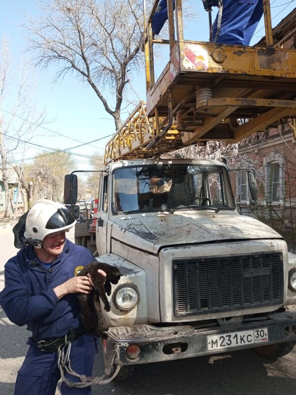 Сотрудники МКП г. Астрахани "Горсвет" помогли "Аварийно-спасательному центру" спасти кошку.