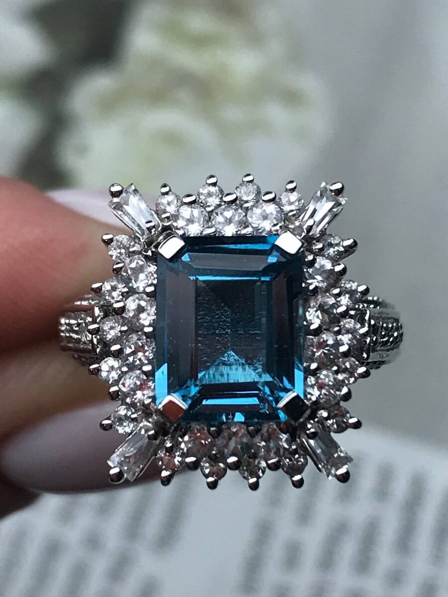 Это потрясающее золотое кольцо с топазом яркого сине-голубого оттенка станет отличным подарком любимой маме, жене, сестре. Его можно преподнести на день рождения, новый год, 8 марта. Оригинальный дизайн не оставит равнодушной ни одну ценительницу прекрасного. Крупный центральный камень изумрудной огранки в окружении сверкающих камушков смотрится еще более ярко, свежо, зрелищно. Холодный оттенок белого золота отлично вписывается в общую композицию.