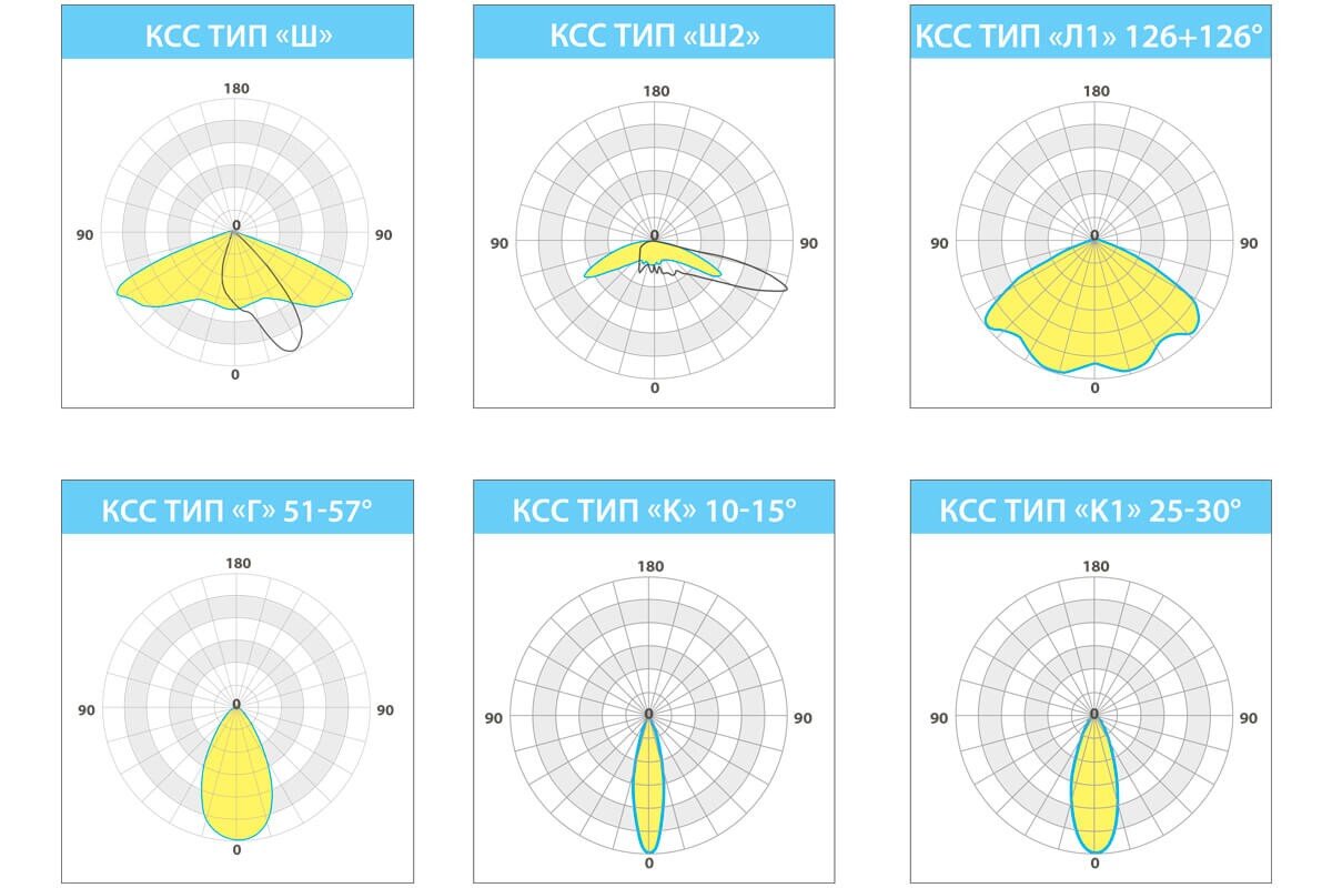 Существует несколько видов КСС, которые отражают различные характеристики распределения света. К их числу относятся: