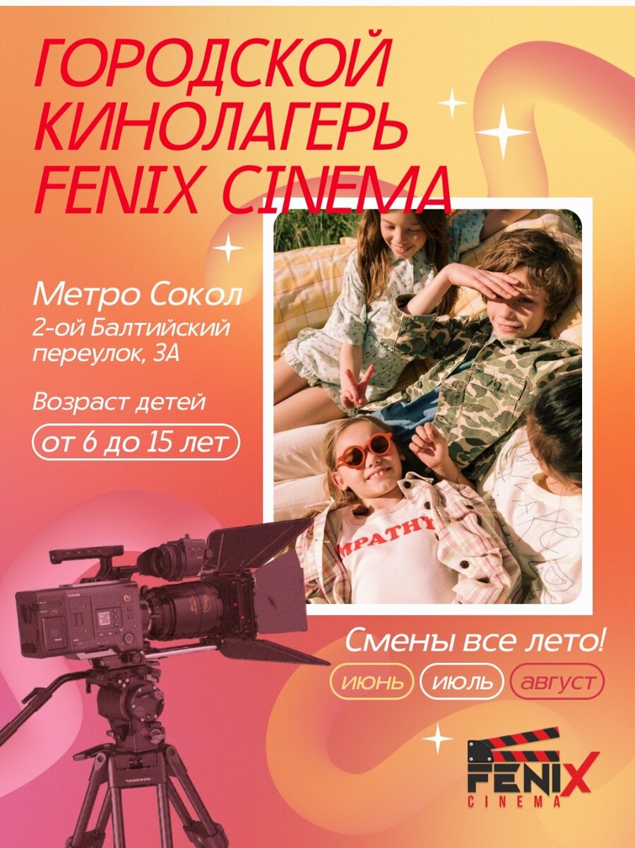 🎬Киношкола Fenix Cinema открывает запись в Летний КиноЛагерь на Соколе! Приглашаем всех детей от 6-15 лет, кто по-настоящему влюблён в кино!📽️😍 🎞️Смены: Июнь / Июль / Август - С понедельника по пятницу, сб и вс выходные. - с 10.00 до 17.00 (сбор в 9.30) - 3-х разовое питание (завтрак, обед и полдник)/ прогулки на свежем воздухе - группы не более 10-ти человек с личным вожатым - Ежедневные занятия с детьми: сценарное и режиссерское искусство, актерская практика, создание Собственного Проекта!🎥🔥 🩶КиноЛагерь «Fenix Cinema» - место, где каждый ребенок познакомится с кинопрофессиями, поработает в кадре и выпустит свой первый совместный проект! 🎞️Длительность смены: 1 неделя Каждую смену создаем Новый проект!🔥🩶 Поэтому можно посещать хоть все смены на все три месяца! _______________________________ Стоимость: Одна смена/ 1 неделя - 25500 руб., предоплата 5000 руб. Скидки: - За 2 го (своего) ребенка - 20% скидка - За друга/подругу - 10% скидка #ле