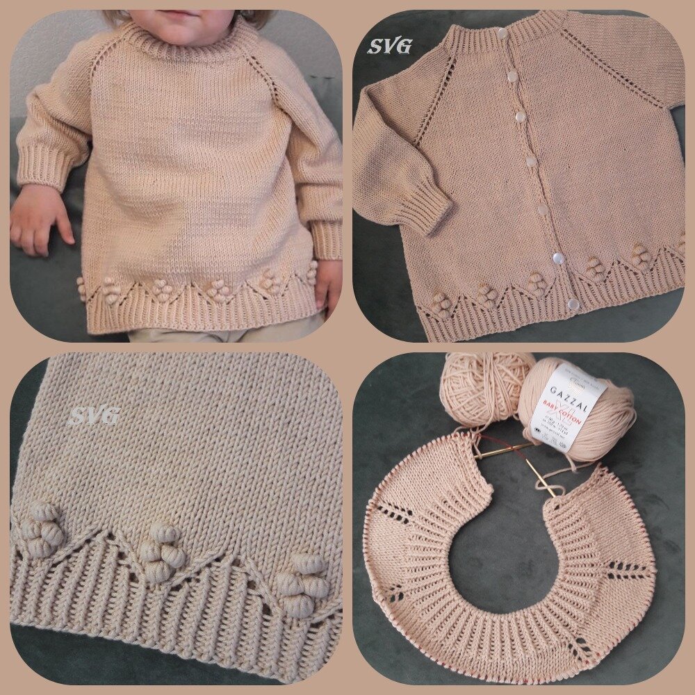 Стандартный реглан сверху, вывязан росток на 5 поворотов с каждой стороны, застежка на спинке полностью до низа